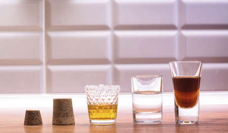 Assortment of five strong alcoholic drinks and spirits in small glasses. Different Lithuanian alcoholic beverages on a wooden bar counter.