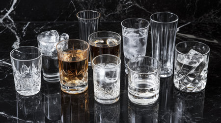 A variety of drinking glasses including highballs, lowballs, and shot glasses, all neatly lined on a black marble surface