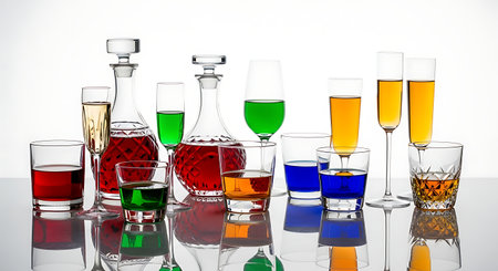 A vibrant collection of alcoholic drinks in different hues, including red, green, blue, and amber, presented in an array of glassware and elegant decanters, creating a festive and inviting display.