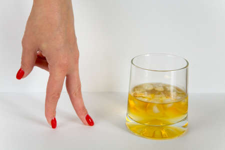 Time of whiskey. A glass of whiskey and a woman's hand with a beautiful manicure.