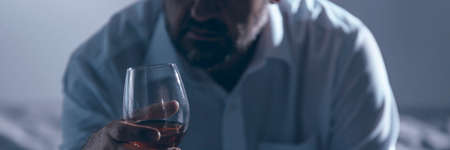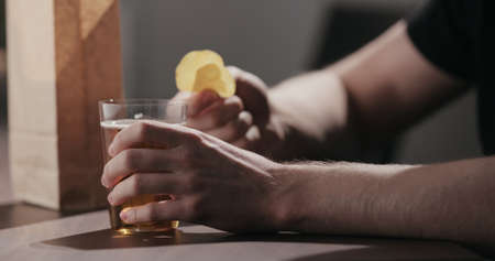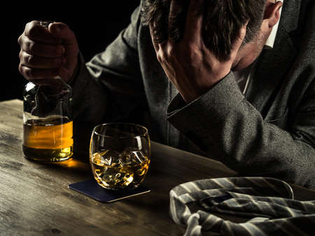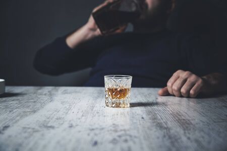 Alcohol addicted man at the table. Sad depressed male adult in quarantine