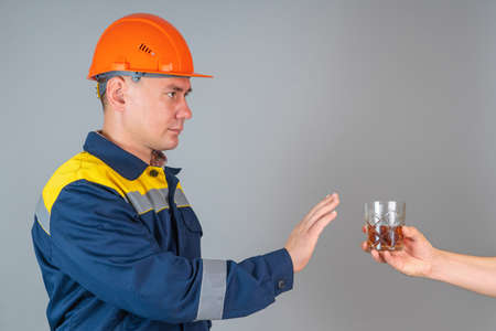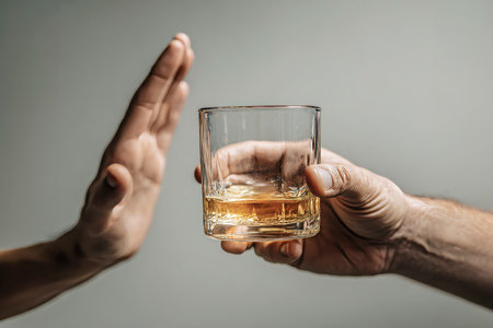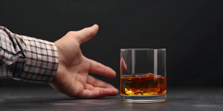 A mans hand gesturing to reject a glass of whiskey symbolizing quitting alcohol and overcoming addiction. Concept Addiction Recovery, Overcoming Challenges, Positive Lifestyle Changes