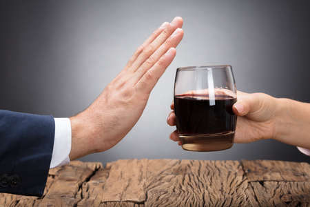 Person's hand making a stop gesture, refusing a glass of alcoholic drink