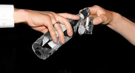 The vodka bottle in hands of one man pours vodka in wine-glass of other man