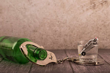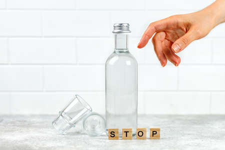 Glass Bottle of vodka, tequila and empty shot glass on gray background, copy space. Stop alcoholism concept. alcohol addiction.