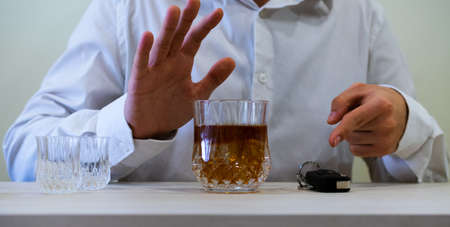 Young unrecognizable man rejecting whiskey, pointing to his car keys. Driving responsibly concept