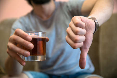 Man refusing to drink whiskey at home, closeup. Alcohol treatment addiction