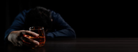 alcoholic depressed and drunk addict man sitting in front of whiskey glass trying holding on drinking in dramatic expression suffering alcoholism and alcohol addiction on isolated background
