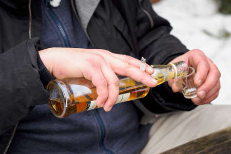 Young man, lost in the vices of alcoholism, smoking and drug addiction