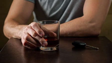 Tipsy man wearing grey t-shirt drinks whiskey from glass to bottom and takes car key deciding to drive auto after alcohol extreme closeup.