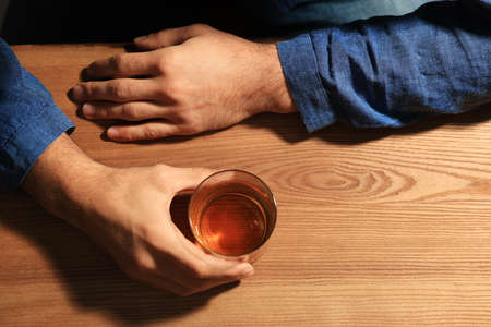 Addicted man with glass of alcoholic drink at wooden table, closeup