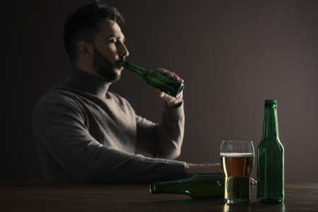 Addicted man drinking alcohol at wooden table indoors, focus on glass of beer