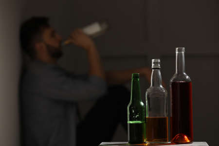 Addicted man sitting near wall indoors, focus on table with alcoholic drinks. Space for text