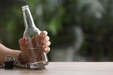 Man chained to bottle of vodka at table against blurred background, closeup with space for text. alcohol addiction