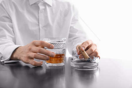 A man drinks whiskey, a businessman relieves stress from work sitting and drinking whiskey in the office after finishing a hard job, a drunk man. Alcohol drinking concept.