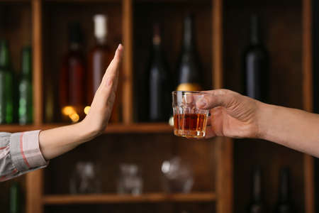 Woman refusing to drink whiskey in bar. Concept of alcoholism