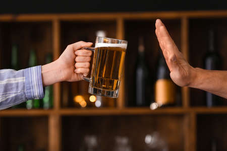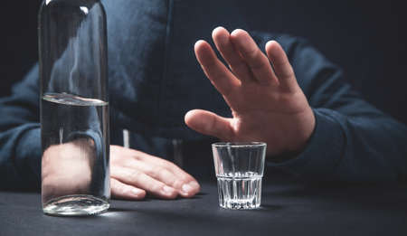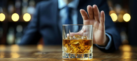 Man refusing to drink whiskey indoors, closeup. alcohol treatment addiction