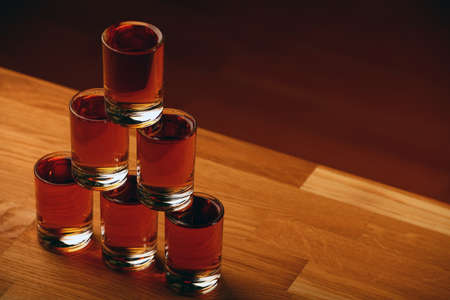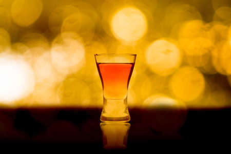 Cocktail Glass with brandy or whiskey - Small Shot on golden bokeh light background.