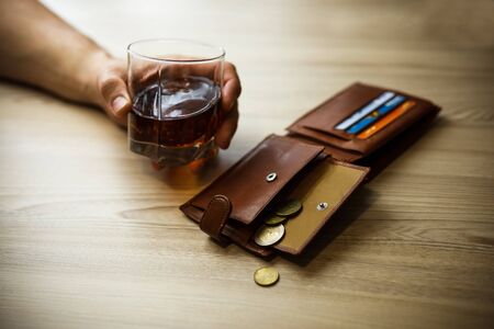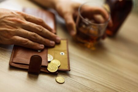 Fired man countsing his last money to drink expensive alcohol. Wrinkled alcoholic sits at brown wooden table with a glass of cognac with ice, on the table, empty wallet with coins