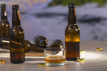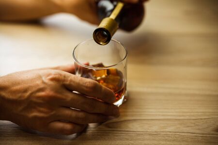 Hands pour a drink into a glass. The problem of alcoholism. The abuse of alcohol. social and family problems. Soft focus