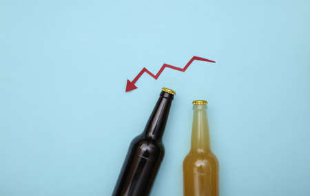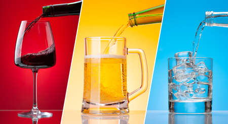 Red wine, beer and water pouring from bottles over colorful background. Various drinks set