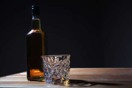 Whiskey on wooden table against dark background, space for text. Alcohol addiction