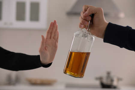 No more alcohol concept. Close up shot of hand refusal alcohol from the man sitting opposite side holding bottle of whisky trying to invite him to drink together in night bar restaurant.