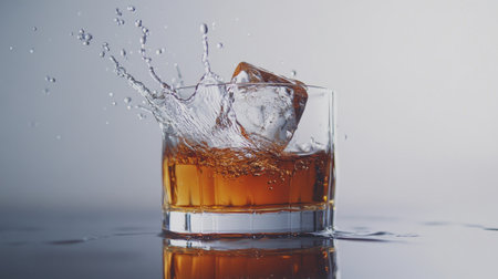 A dramatic shot of a single ice cube splashing into a glass of whiskey, capturing the moment of impact and the richness of the drink, with a soft white background for focus.