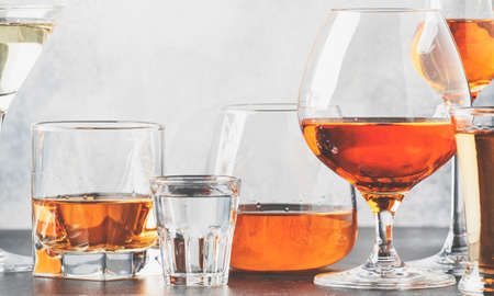 Selection of hard strong alcoholic drinks big glasses and shot glass in assortment: vodka, cognac, tequila, brandy and whiskey, grappa, liqueur, vermouth, tincture, rum. Vintage bar counter background, selective focus, copy space