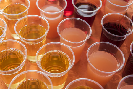 Red, strong alcoholic drink in small glasses on bar waiting to be served
