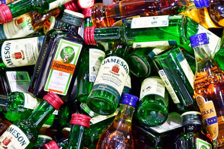 Dubai, United Arab Emirates - march 17, 2022 different varieties of alcohol bottles on a grass display outdoor