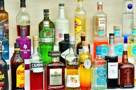 Verona, Italy - December 9, 2016: Many brand of liquor bottle at bar.