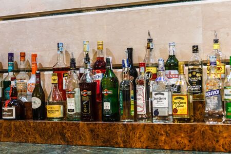 Moscow, Russia - December, 2018: Various alcohol bottles in a bar or restaurant.