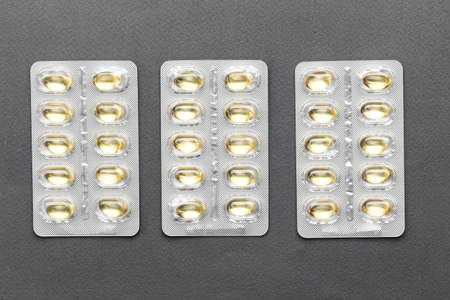 Blister package with fish oil capsules on color background. Medicine pills on a light background. Medicines and prescription pills flat lay background. Yellow medical tablets in blister.