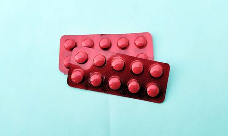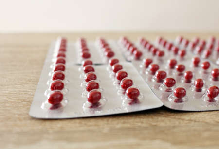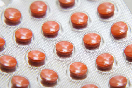 Medicine Red round tablets in a packaging in capsules on background