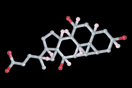 Cholic acid molecule isolated on black background, 3D illustration. A major primary bile acid produced in the liver, it facilitates fat absorption and cholesterol excretion