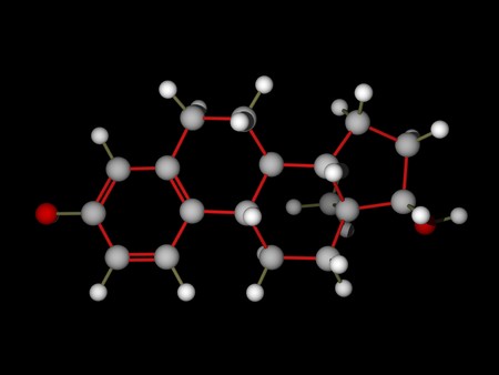 Molecular structure of estradiol. Atoms are represented as spheres with conventional color coding: carbon (grey), oxygen (red), hydrogen (white). Scientific background. 3d illustration