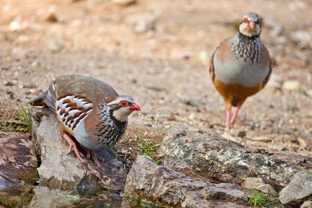 Red-legged partridge (Alectoris ruficollis) perched on a rock