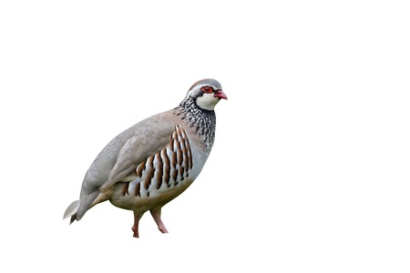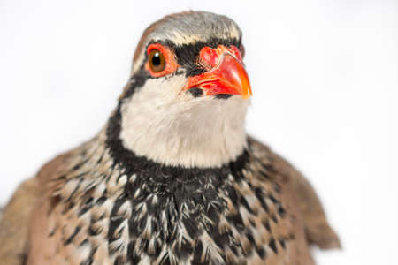 Close-up of red-legged partridge, on white background. Wildlife studio portrait.