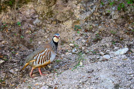 Adult Red-legged Partridge (Alectoris rufa) standing on the ground in Spain.