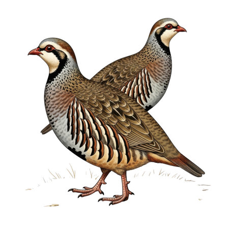 The image depicts two partridges standing side by side in a natural setting. The birds have intricate feather patterns with shades of brown, black, and white. Their distinct markings and alert posture are prominent features. The background is simple, emphasizing the birds as the main subjects.