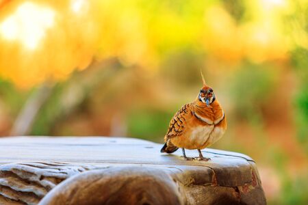 One Crested Pigeon resting on a stone with blurred nature background. Desert Park at Alice Springs, MacDonnell Ranges in Northern Territory, Australia. Copy space.