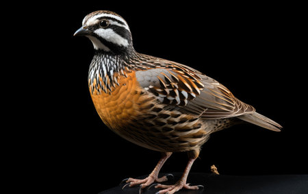 a brown quail stands gracefully on a white background, showcasing a fusion of mexican and american cultures through its vibrant orange and emerald style. the photograph, captured by bill durgin, features mixed patterns and a strong facial expression, capturing a sense of suburban ennui. ai generated