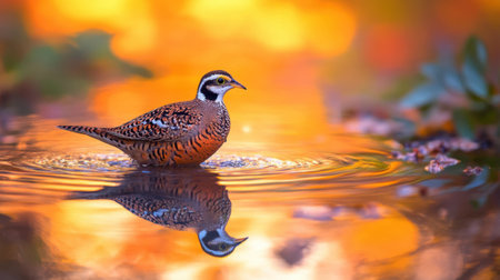 A Northern Bobwhite drinking from a reflective pond in Texas, its rippling reflection framed by the vibrant colors of sunset.
