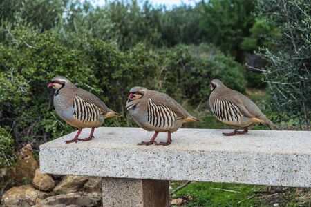 Three chukar partridge (Alectoris chukar) at the Cape Sounion in the coast of East Attica, Greece