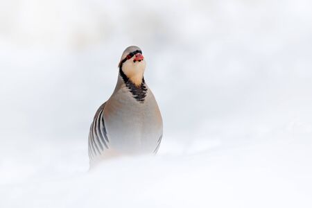 Rock partridge, Alectoris graeca, gamebird in the pheasant family, in the snow during winter. Bird in the white habitat, Hemis NP, Ladakh, India. Partridge from Asia mountain. Detail portrait of bird