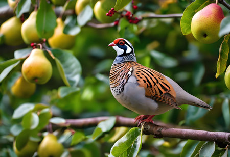 Partridge on a branch of pear tree with pears.