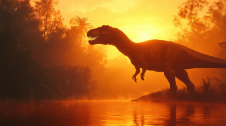 A striking silhouette of a dinosaur against a colorful sunset creates an enchanting prehistoric scene. Lush trees and calm water enhance the serene atmosphere.