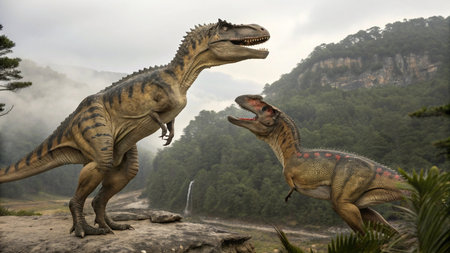 Dinosaurs flock beast of prehistoric era in wilds. Dangerous jurassic animal in forest. Generative AI