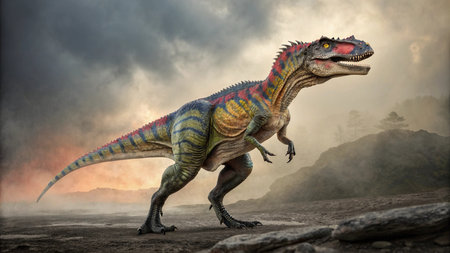 Allosaurus in a whimsical and colorful style. In natural habitat. Jurassic Park